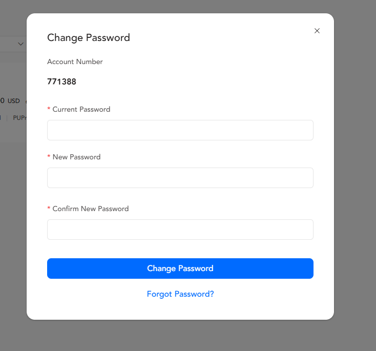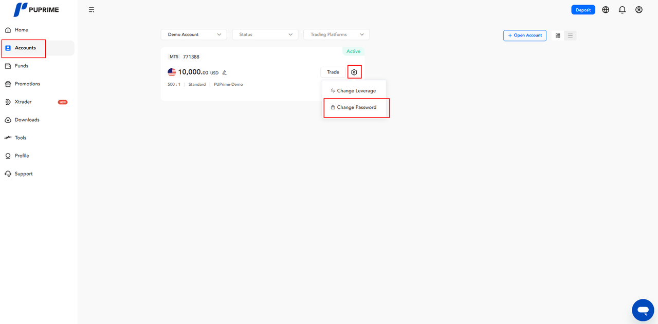 - To change the password for your demo account, log in to your client portal, navigate to 'Account,' select your Demo account, and click the