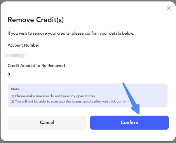 - Bonus credits are non-reversible: Once you click "Confirm" to remove the bonus, the credits cannot be reinstated under any circumstances.