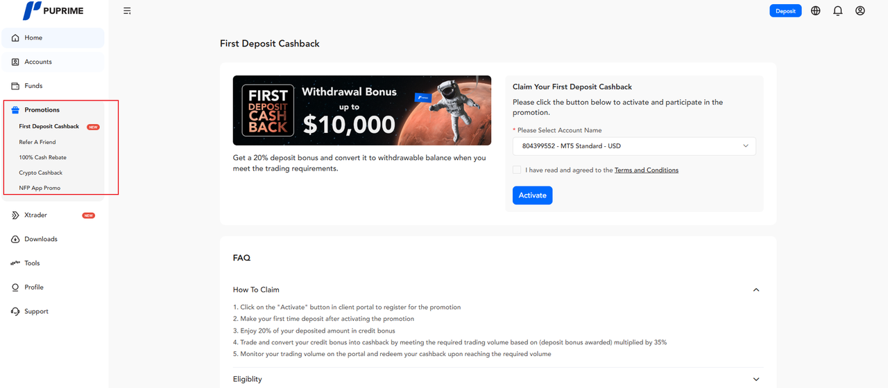 After logging into the Client Portal, you can select "Promotion" from the dashboard menu and choose the desired promotion. For a detailed explanation of a specific promotion, please visit our Help Centre at