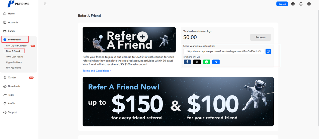 PU Prime UAE Account Management Client Portal How to find your unique referral link to refer your friends from the Client Portal? After logging into the Client Portal, select "Refer a Friend" under the "Promotion" tab. Clients will then be able to access their personalised referral link.