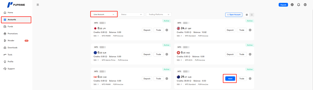 - Please ensure all positions are closed, otherwise the reset button will not appear under your trading account.
