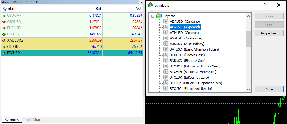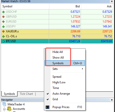If you want to view more products, you can right-click on "Market Watch" in MT4/MT5 and select "Symbols". Add the products you want to view by clicking "Show", or you can select "Show all" to see all products.