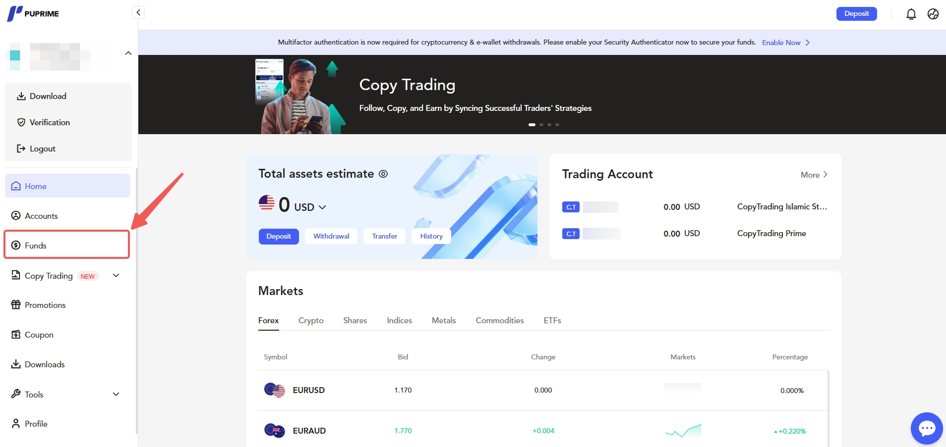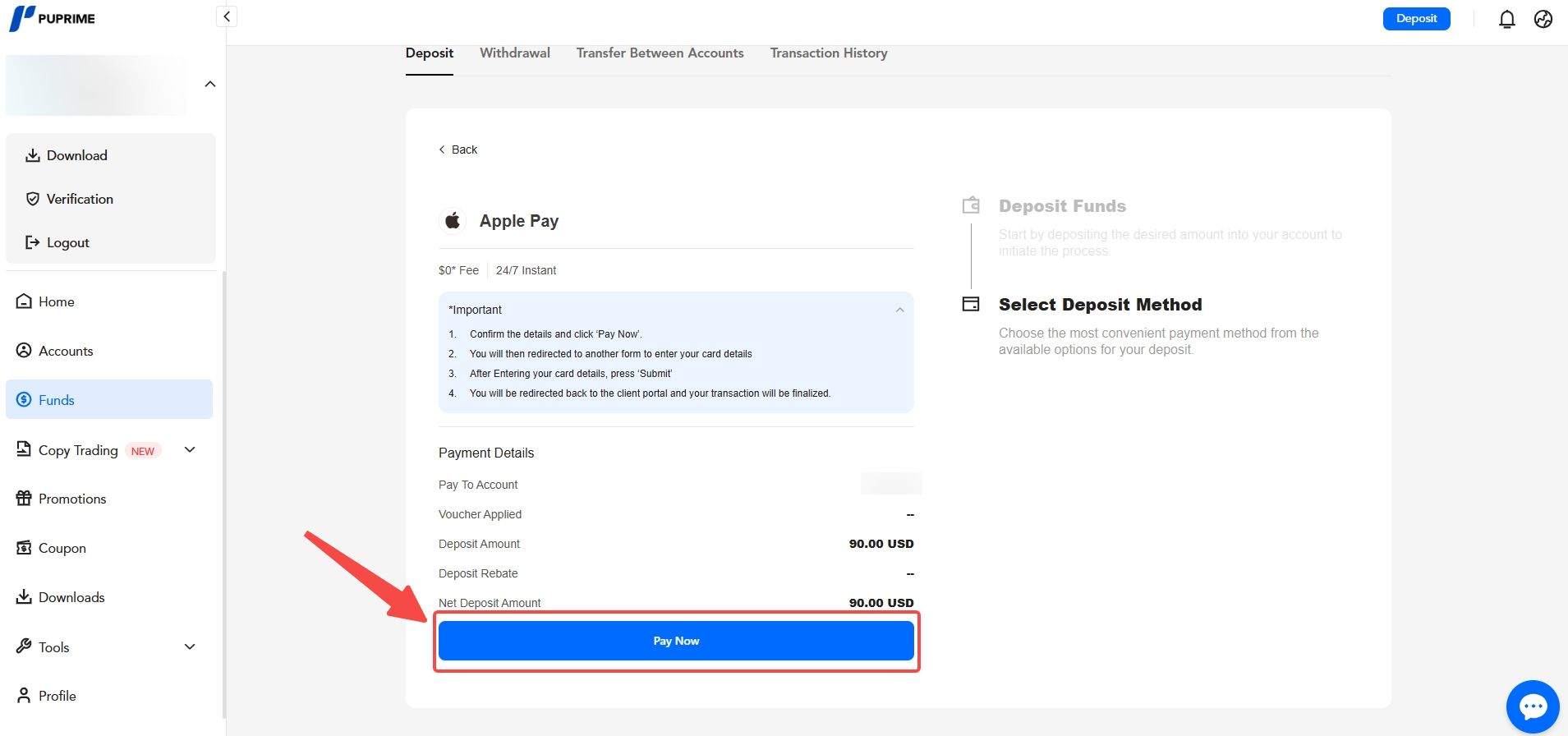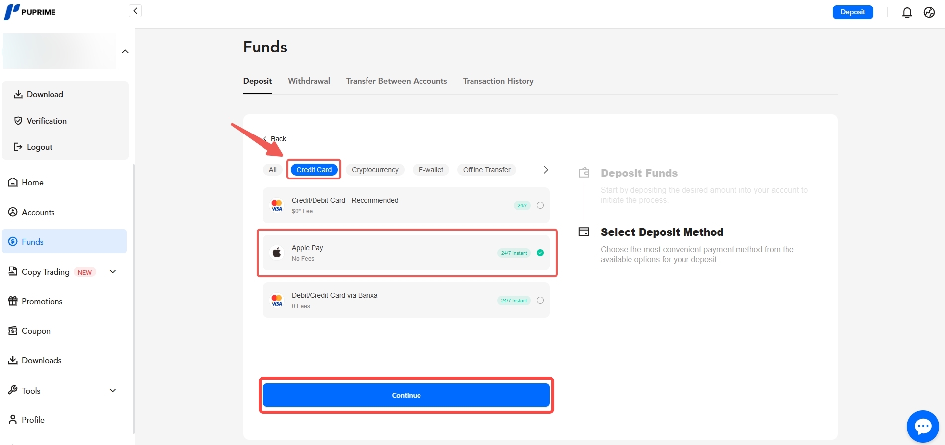 2. Click "Deposit", select the trading account you wish to fund, enter the deposit amount, and click "Continue".