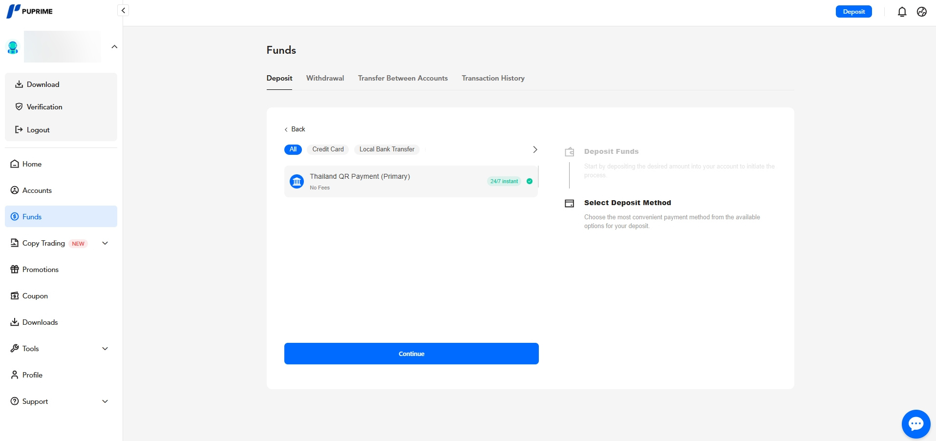 2. Click "Deposit", select the trading account you wish to fund, enter the deposit amount, and click "Continue".