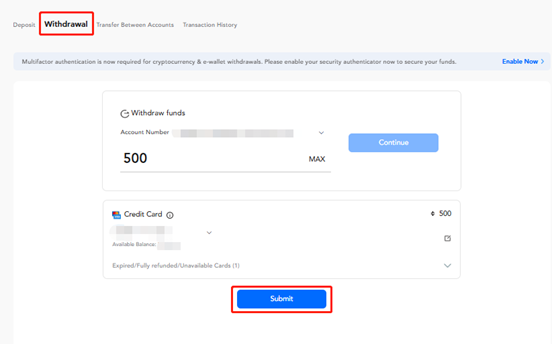 PU Prime UAE Deposits and Withdrawals Withdrawals How to withdraw funds via credit card? Log in to your Client Portal - click "Funds" - select "Withdrawal" and input "Withdrawal Amount" to be withdrawn and click on the "Continue" button. The credit card with available balance will be automatically selected and you will just need to click "Submit" to proceed with the withdrawal.