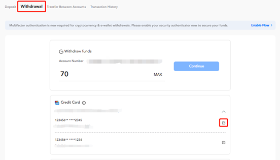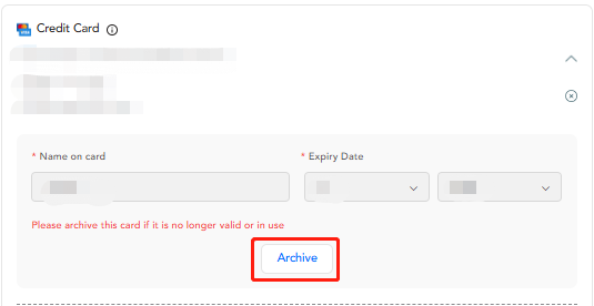 To archive the credit card, on the "Withdrawal" page, after inputting the withdrawal amount, the credit card will appear, click the button shown below to archive the credit card.