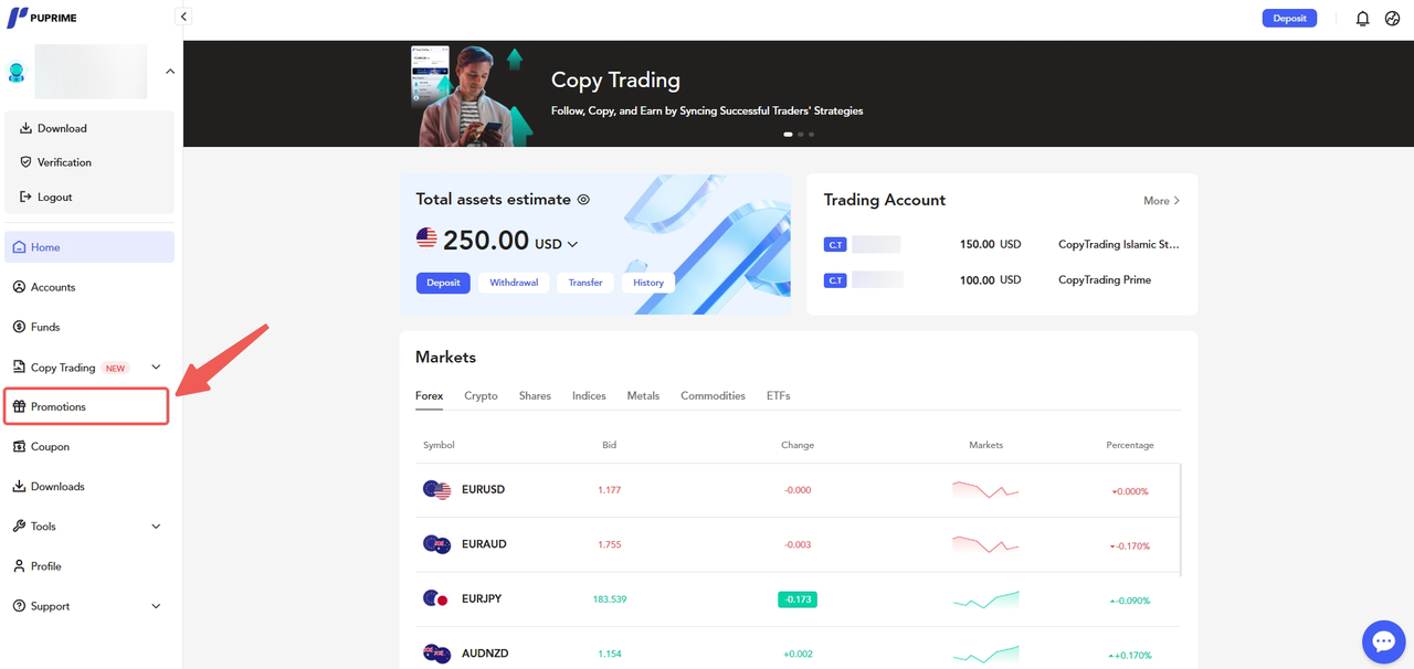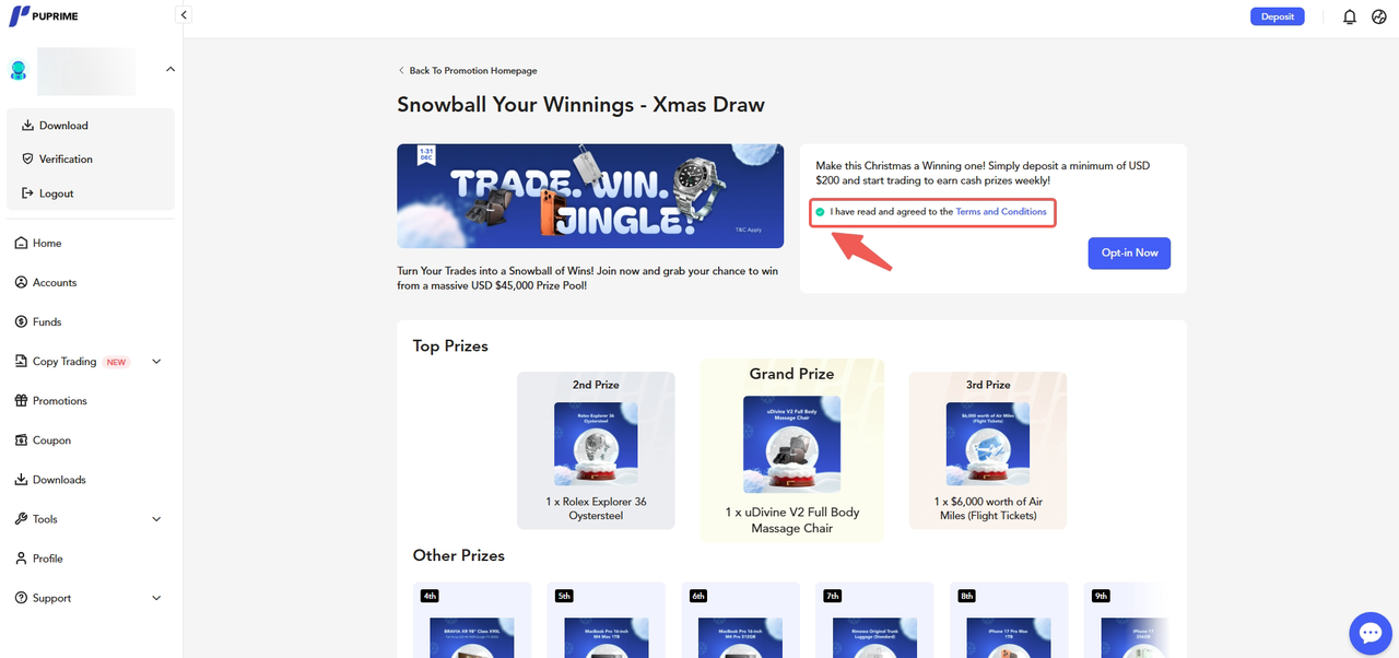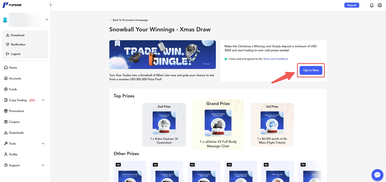 PU Prime UAE Promotions Promotions - General FAQs How to Opt-in to a promotion in Client Portal? To opt in to a promotion via your Client Portal, please follow the steps below:Click the “Promotions” button on the left sidebar. Select your preferred promotion. Tick "I have read and agreed to the Terms and Conditions" Click "Opt-in Now" to complete the opt-in process.