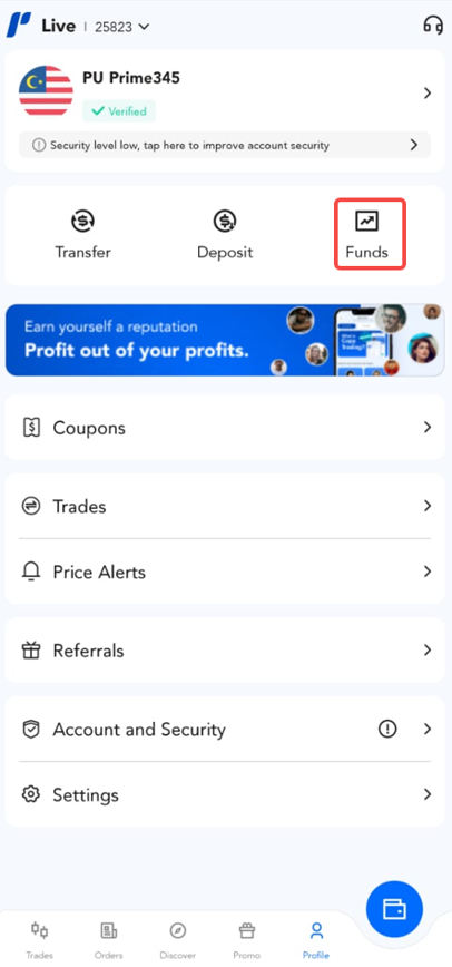 PU Prime UAE PU Prime App PU Prime App Enquiry How to withdraw funds in the PU Prime APP? Click on the "Profile" button. Click on the "Funds" button. Click "Withdraw" to proceed with your withdrawal request. Select your account and your withdrawal amount and click "Next".